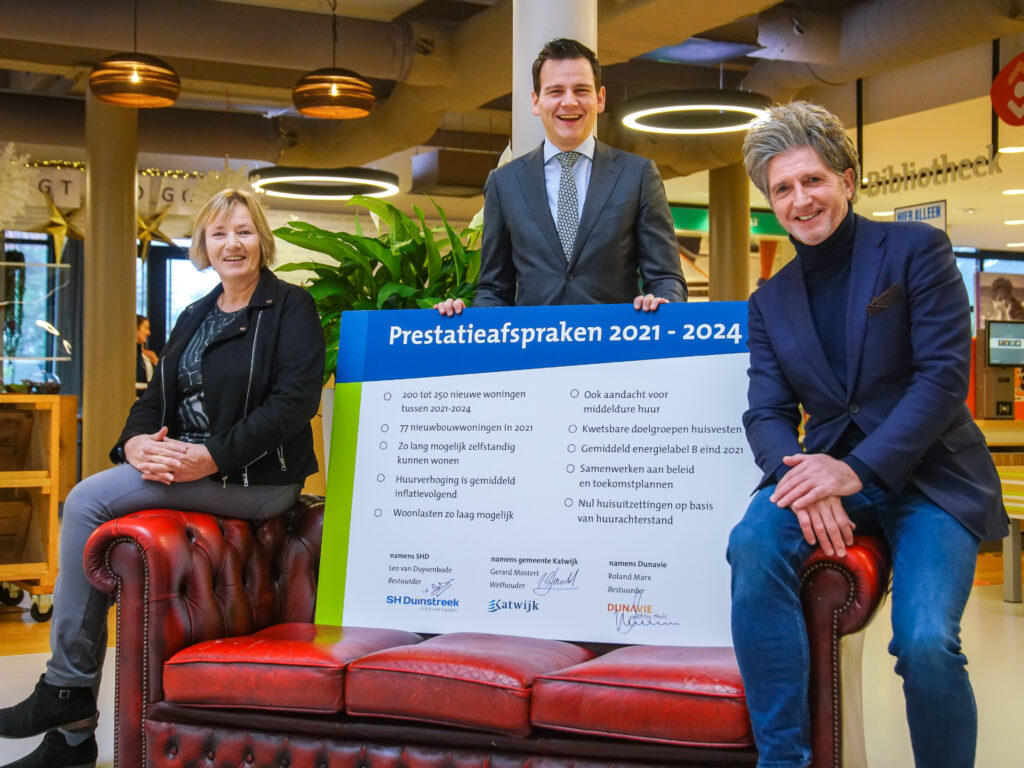 Op 9 december ondertekenden wethouder Gerard Mostert (gemeente Katwijk), Roland Marx (woningcorporatie Dunavie) en Nel van Dam i.o. van Leo van Duyvenbode (Stichting Huurdersbelangen ‘de Duinstreek’) de prestatieafspraken Katwijk. In deze afspraken is aangegeven wat partijen de komende 4 jaar met elkaar willen bereiken aan betaalbaar wonen in een fijne woonomgeving.